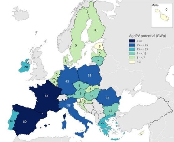 Potencial en GWp (escenario uso del 1% del territorio por agrovoltaica) por países de la UE