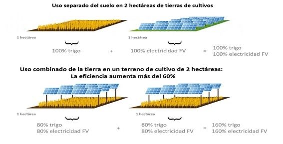 La agrovoltaica puede consistir en un doble uso del terreno combinando producción de energia renovable a través de la fotovoltaica con agricultura o con ganadería, siempre que exista un uso sinérgico de las sombras que producen los paneles fotovoltaicos.