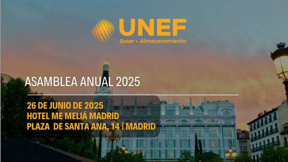 UNEF - Unión Española Fotovoltaica celebrará su Asamblea Anual de Socios el jueves 26 de junio a las 18.00h en la sala plenaria el hotel ME Meliá Reina Victoria en Madrid.