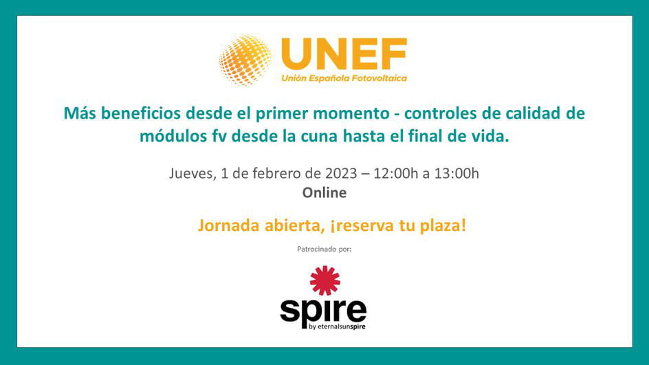 UNEF y Spire Solar organizan el webinar gratuito “Más beneficios desde el primer momento - controles de calidad de módulos fv desde la cuna hasta el final de vida.”